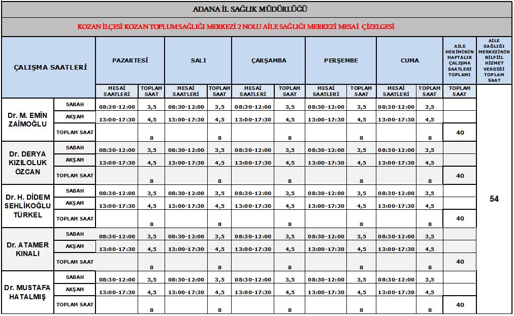 Çalışma Programımız * Çizelgeyi büyük görmek için lütfen üzerine tıklayınız. Mobil (Gezici) Hizmet Çizelgesi; Dr. Derya Kızıloluk Özcan - Salı 11:00Dr. Mehmet Emin Zaimoğlu - Çarşamba 10:30Dr. Hatice Didem Türkel Sehlikoğlu - Perşembe 10:30